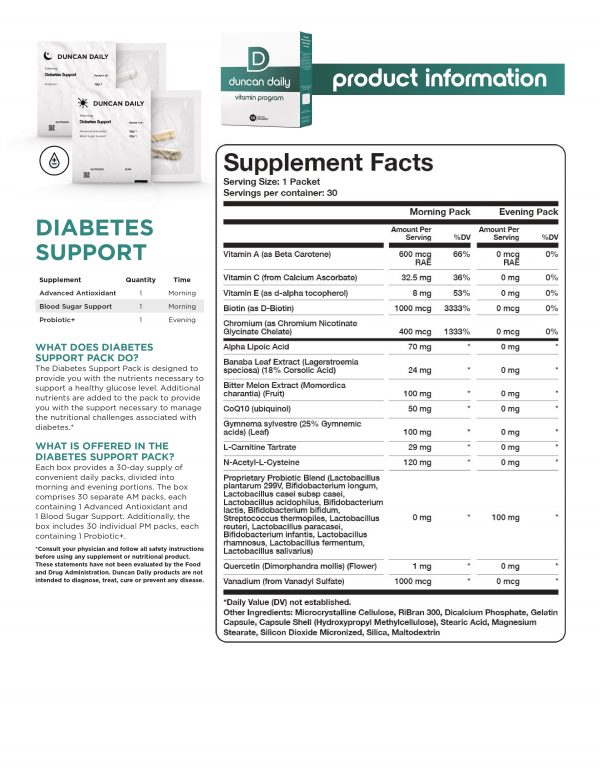 If you are looking for the best supplements for diabetics, our Duncan Daily Diabetes Support Pack, with carefully selected ingredients rich in nutrients, is packed in AM and PM serving sizes, making daily blood sugar support easy and effective. This 30-day nutritional support pack is designed to help you maintain blood sugar metabolism, digestive balance, and improve antioxidant protection – all in a simple daily routine.