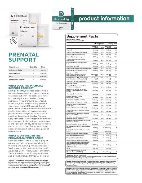 At Duncan Daily, we believe that even the best diet can leave nutritional gaps. Your body’s dietary needs change drastically when you are pregnant or breastfeeding. Our prenatal support pack is expertly formulated with premium iron supplements to provide you with complete prenatal care during pregnancy.
