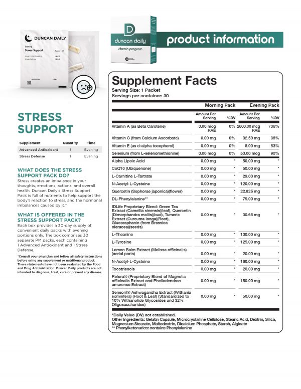 Our stress support pack includes a 30-day supply of daily evening packs, including: